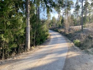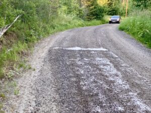 Tie on suolattu tänään illalla. Suolaamisella estetään pölyämistä. Hienoimman tieaineksen sitoutumisen paranemisen pitäisi vähentää myös nimismiehen kiharan syntymistä.